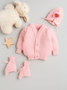 Little Angels Little Angels Sweater Set Baby Wool Full Sleeves V-Neck Solid with Pyramid Design Peach 3-Piece Set Sweater Sets Diamond Buds Baby Knitwear Set 3-6 M / Pink / Baby Wool