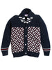 • Color: Navy and White patterned panel with striped cuffs and collar.